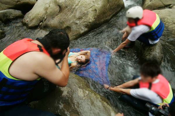 不過,在溪邊拍照,安全很重要。本次的外拍,除了模特兒之外,所有參加人員都是全套的安全裝備,拍攝現場還有二位救生教練全程陪同。
